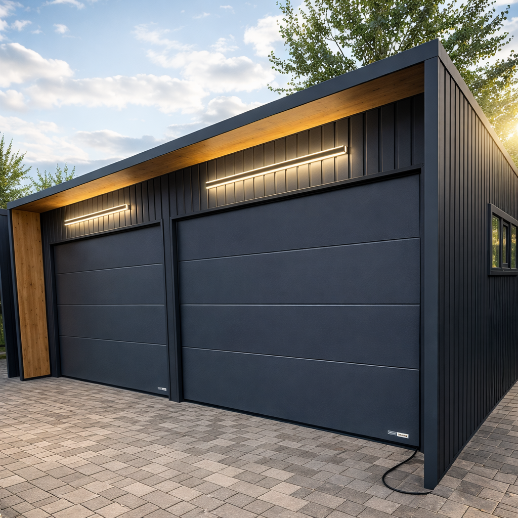 Garaż z płyty warstwowej wygląda bardziej solidnie i „budynkowo”. To dobry wybór, gdy garaż stoi przy nowym domu i ma pasować do nowoczesnej elewacji.