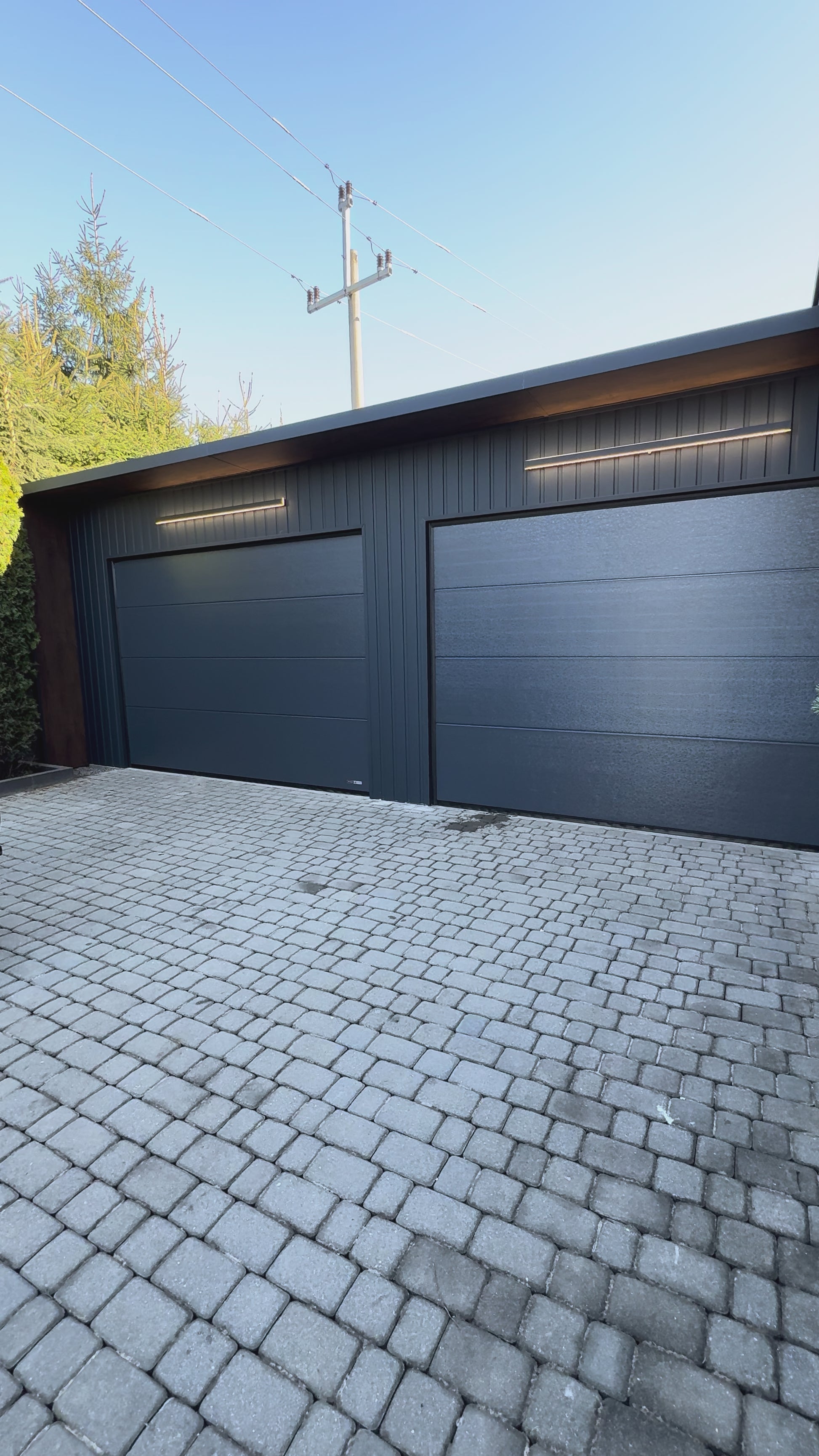 Z zewnątrz garaż wygląda bardziej jak mały budynek gospodarczy niż klasyczny blaszak. Płyta warstwowa daje czystszą, bardziej nowoczesną estetykę, a antracytowy kolor RAL 7016 dobrze pasuje do współczesnych domów, ogrodzeń i stolarki okiennej.